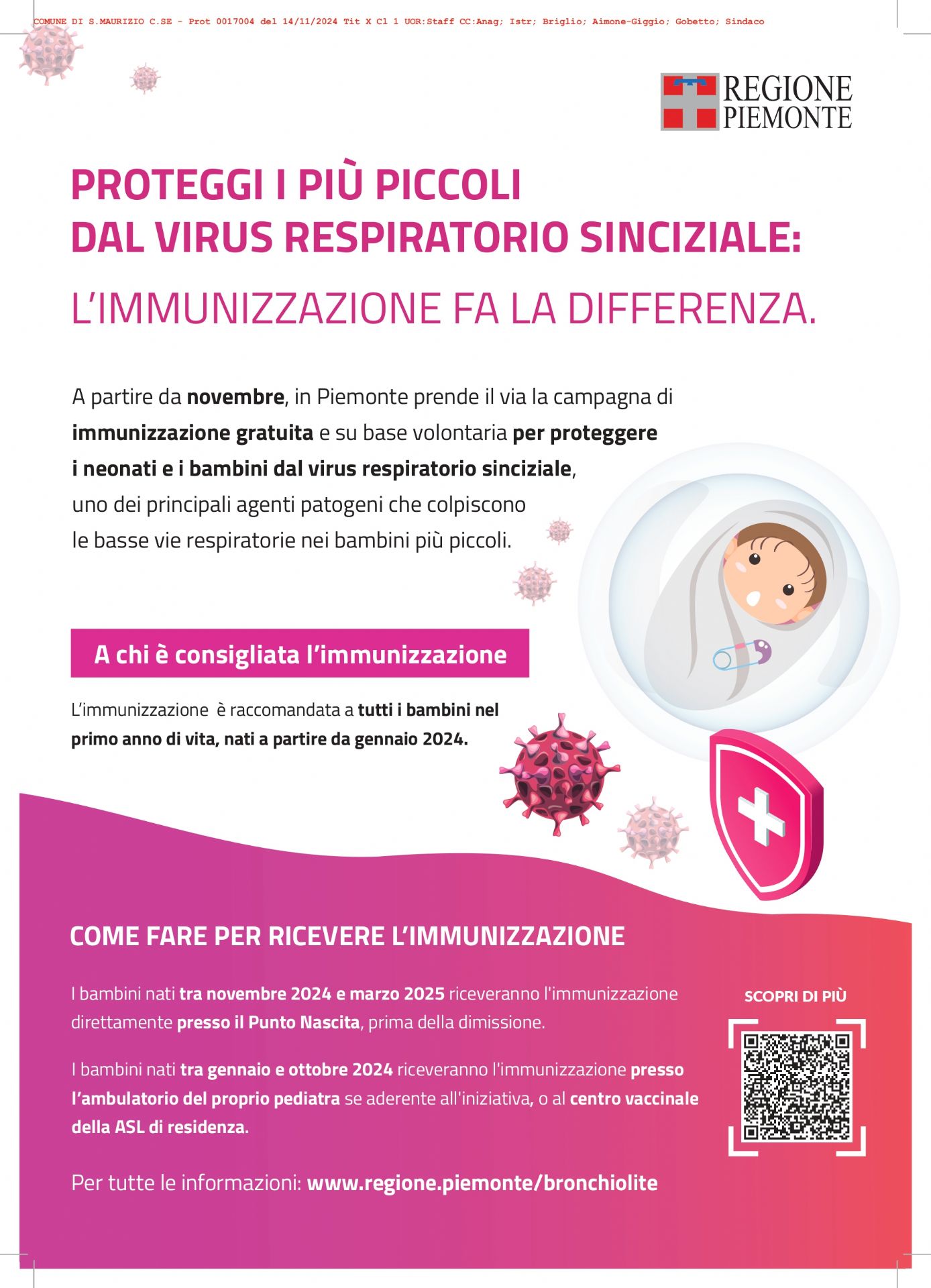 Ha preso il via in Piemonte la campagna di immunizzazione gratuita per proteggere i neonati e i bambini dal virus respiratorio sinciziale. L'immunizzazione è volontaria ma è raccomandata per i bambini nel primo anno di vita, nati dal gennaio 2024 in poi. Tutte le informazioni su www.regione.peimonte.it/bronchiolite