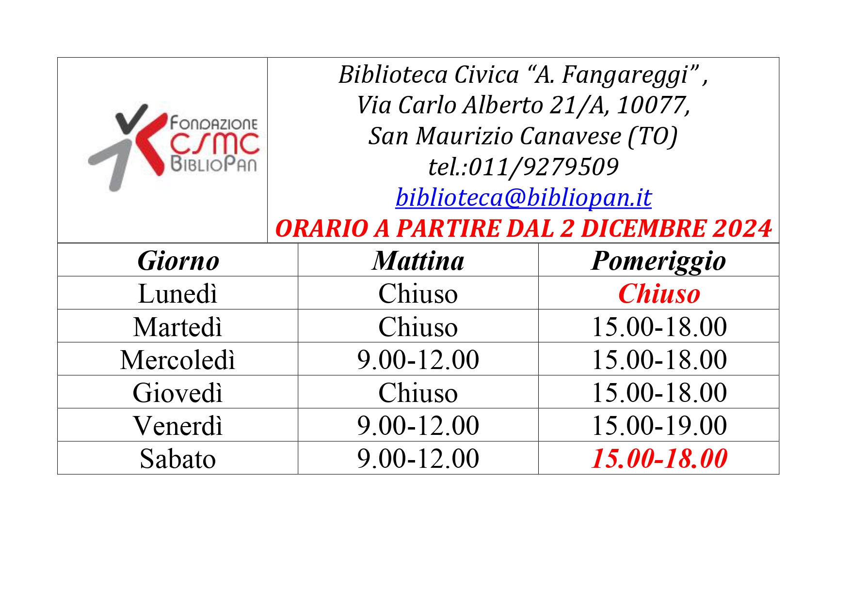 In funzione delle nuove attività, l’orario della biblioteca sarà così scandito: