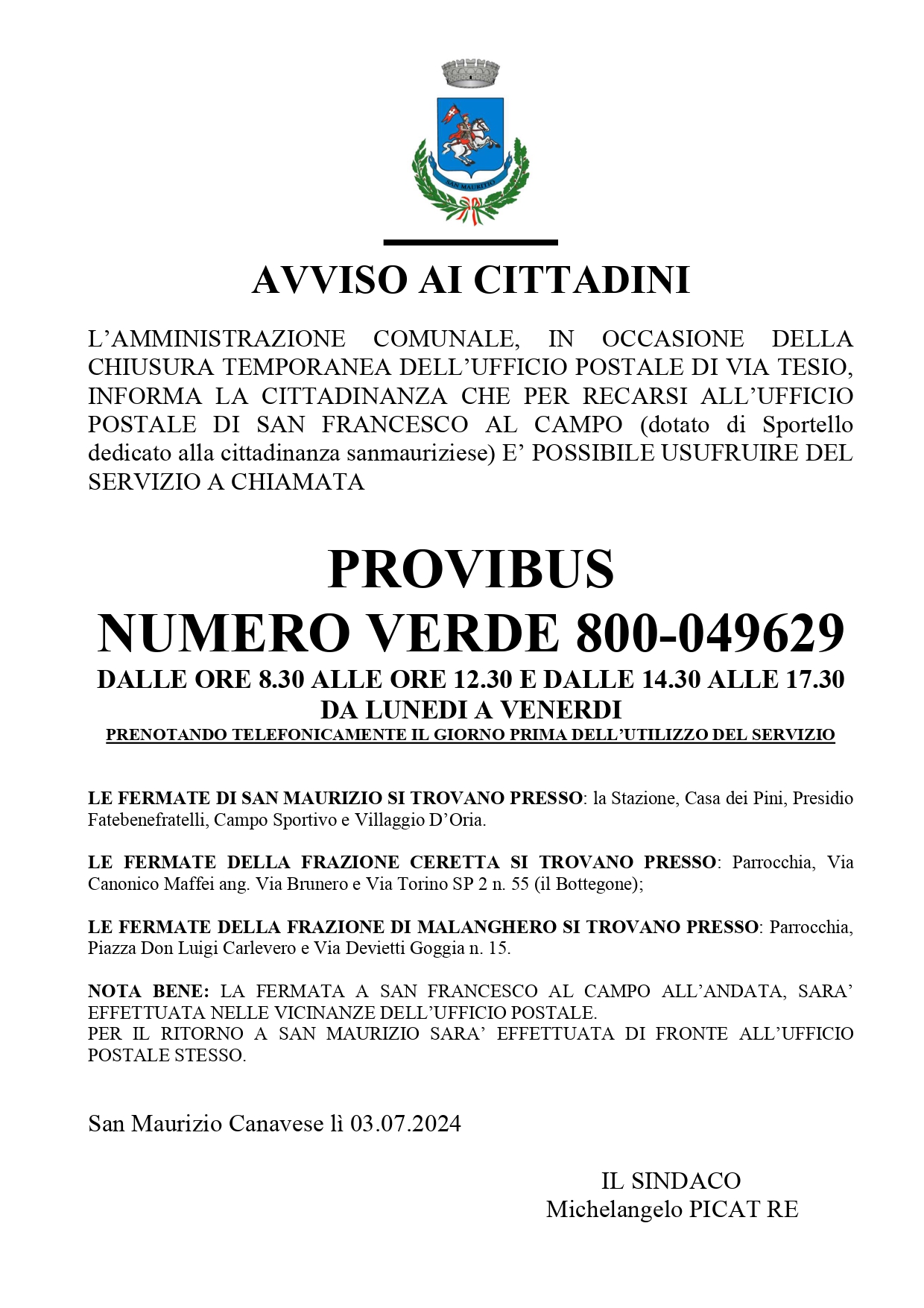 La temporanea chiusura dell'Ufficio Postale di via Tesio sta purtroppo costringendoci a rivolgerci ad altri Uffici Postali del territorio. Ricordiamo che è possibile usufruire del servizio a chiamata Provibus per recarsi direttamente all'Ufficio Postale di San Francesco al Campo. Per prenotare il viaggio basta telefonare con un giorno di anticipo al numero verde 800.049629. Il biglietto si acquista a bordo. Il servizio è attivo dal lunedì al venerdì, dalle 8.30 alle 12.30 e dalle 14.30 alle 17.30.