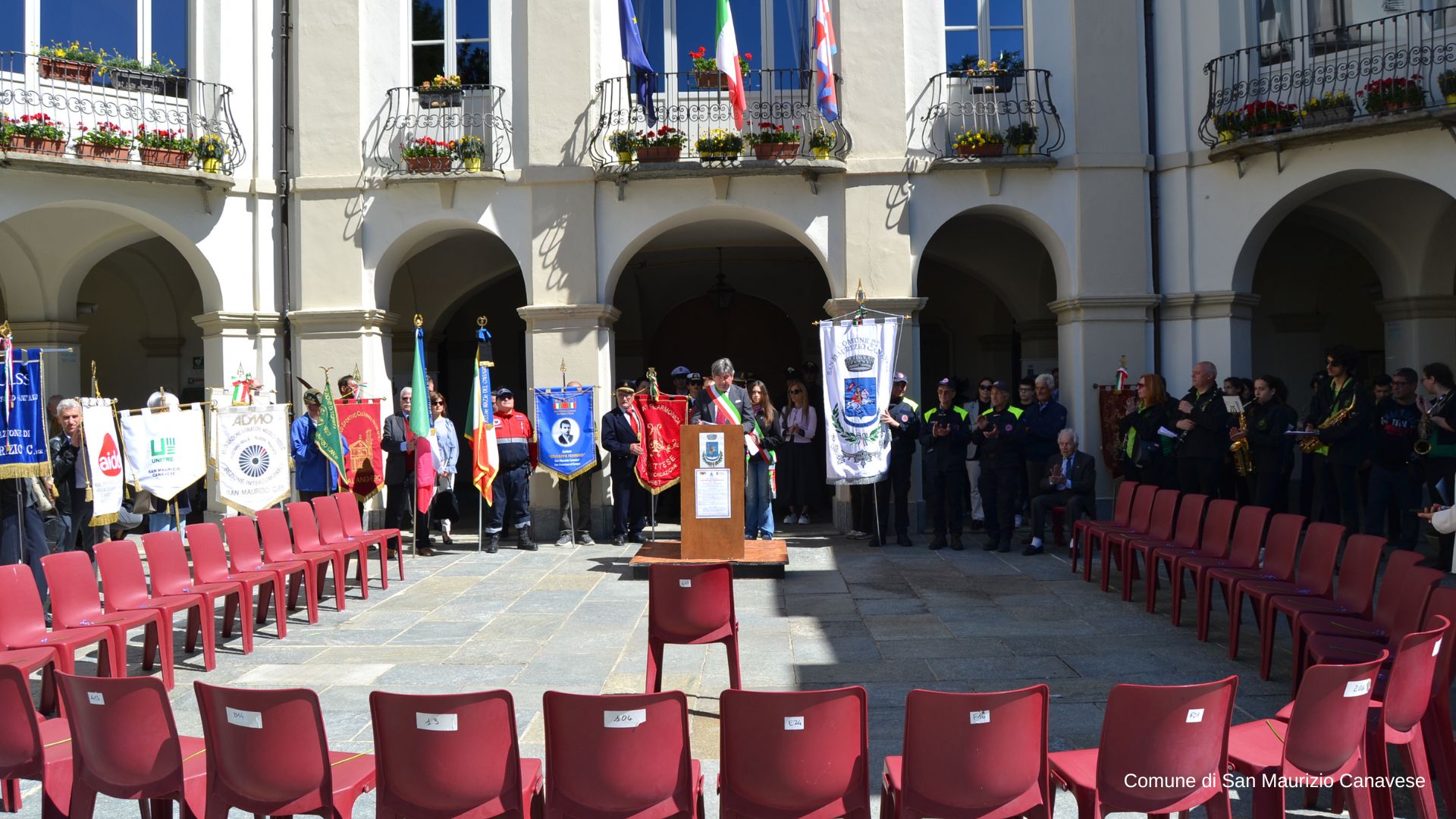 Questa mattina la nostra comunità ha celebrato l'80 anniversario della Liberazione. Cuore dell'evento, come ogni anno, piazza Martiri della Libertà, ovvero i giardini del municipio, con al centro una sedia per ciascuno degli "invitati speciali" di questa particolare edizione della ricorrenza: i cittadini sanmauriziesi caduti durante la Resistenza, più un posto d'onore per il professor Carlo Angela, primo sindaco di San Maurizio Canavese dopo la Liberazione.