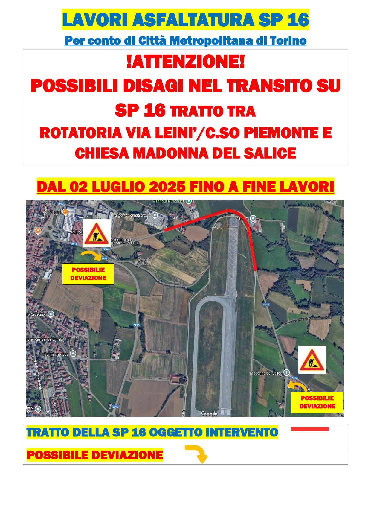 Da oggi, mercoledì 2 luglio, i lavori di Città Metropolitana di Torino per l'asfaltatura della Sp 16 interesseranno il tratto compreso fra la rotatoria all'intersezione fra via Leinì e corso Piemonte e la cappella della Madonna del Salice a Malanghero. Vi invitiamo a prestare la massima attenzione alla segnaletica e a utilizzare i percorsi alternativi eventualmente indicati.