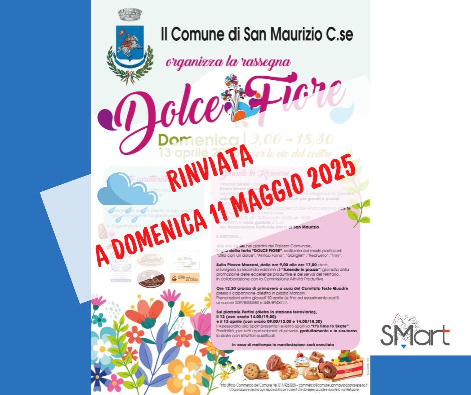 Le previsioni meteo per questa domenica sono poco incoraggianti. I tre eventi in programma per il fine settimana - "Dolce Fiore", "It's time to Skate" e "Aziende in Piazza" - sono rinviati al secondo fine settimana di maggio, sperando in un tempo più stabile.