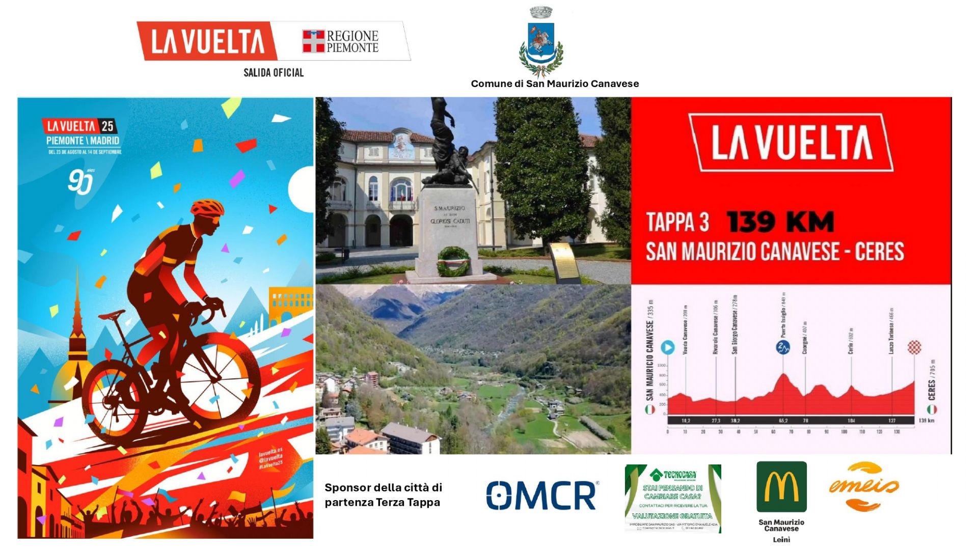 Ci siamo! A due passi da noi, a Venaria Reale, domani sarà dato il via all'ottantesima edizione della Vuelta a España: la prima tappa partirà dalla Reggia per concludersi a Novara. Domenica la seconda tappa, da Alba a Limone Piemonte. E lunedì la terza tappa, la "nostra"! Da San Maurizio Canavese a Ceres, lungo uno spettacolare percorso attraverso il Canavese.
