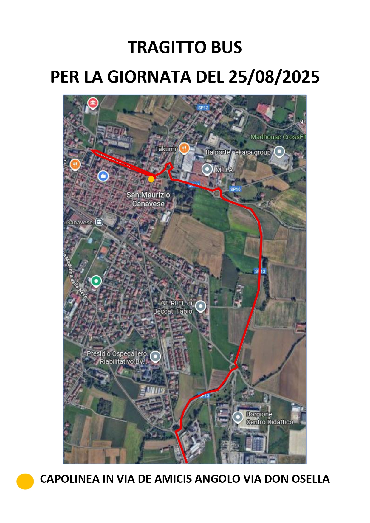 Il percorso del bus in arrivo da Torino sul nostro territorio sarà il seguente: via Fatebenefratelli, corso Piemonte, via Leinì, rotonda via Remmert, via De Amicis, inversione in via De Amicis e fermata capolinea in via De Amicis angolo via Don Osella.