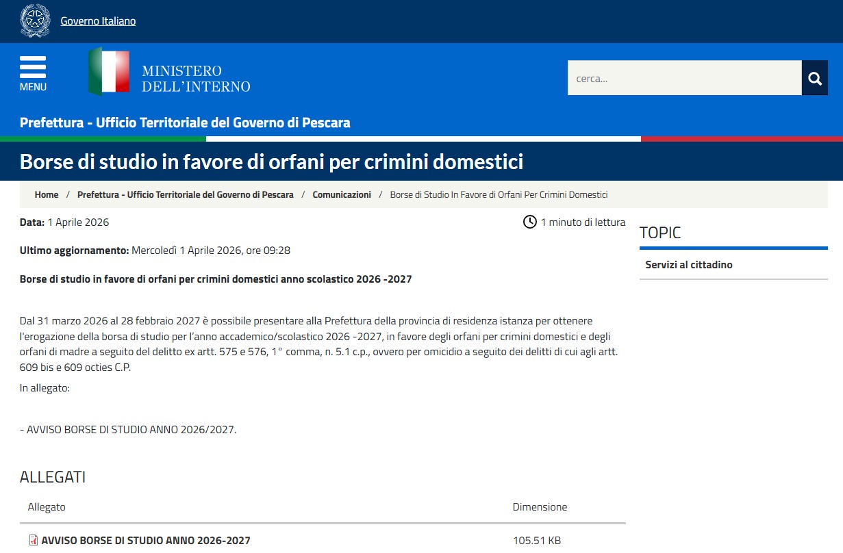 Il Ministero dell'Interno ci chiede di comunicare che fino al 28 febbraio 2027 è possibile presentare istanza alla Prefettura per ottenere l’erogazione della borsa di studio per l’anno scolastico/accademico 2025/26 in favore degli orfani per crimini domestici e degli orfani di madre a seguito del delitto ex artt. 575 e 576, primo comma n. 5.1 del c.p., ovvero per omicidio a seguito dei delitti di cui agli articoli 609 bis e 609 octies del c.p.